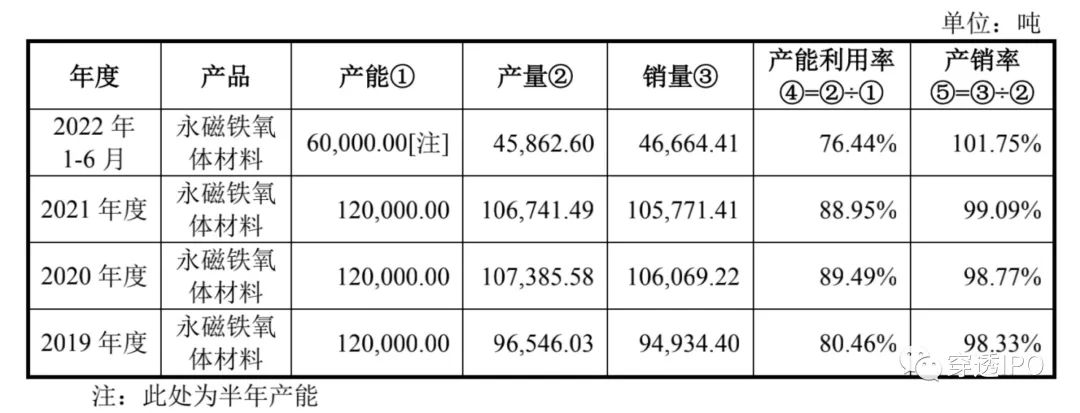 2019年-2022年6月,安特磁材的产销率分别为98.33%、98.77%、99.09%、101.75%,从销量数据看,永磁铁氧体材料产品不愁销路,但其产能利用率为80.46%、89.49%、88.95%、76.44%,对比已经上市的金力永磁(300748.SZ)产能利用率达到95%以上,正海磁材(300224.SZ)钕铁硼磁材产能利用率达到了105%。