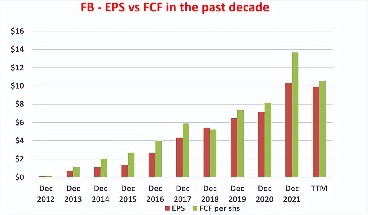 通过下图所示的自由现金流和每股收益比较,已经可以看到差异。你可以看到Meta的 FCF 一直高于 EPS。因此,其FCF收益转换率一直且大幅高于1。