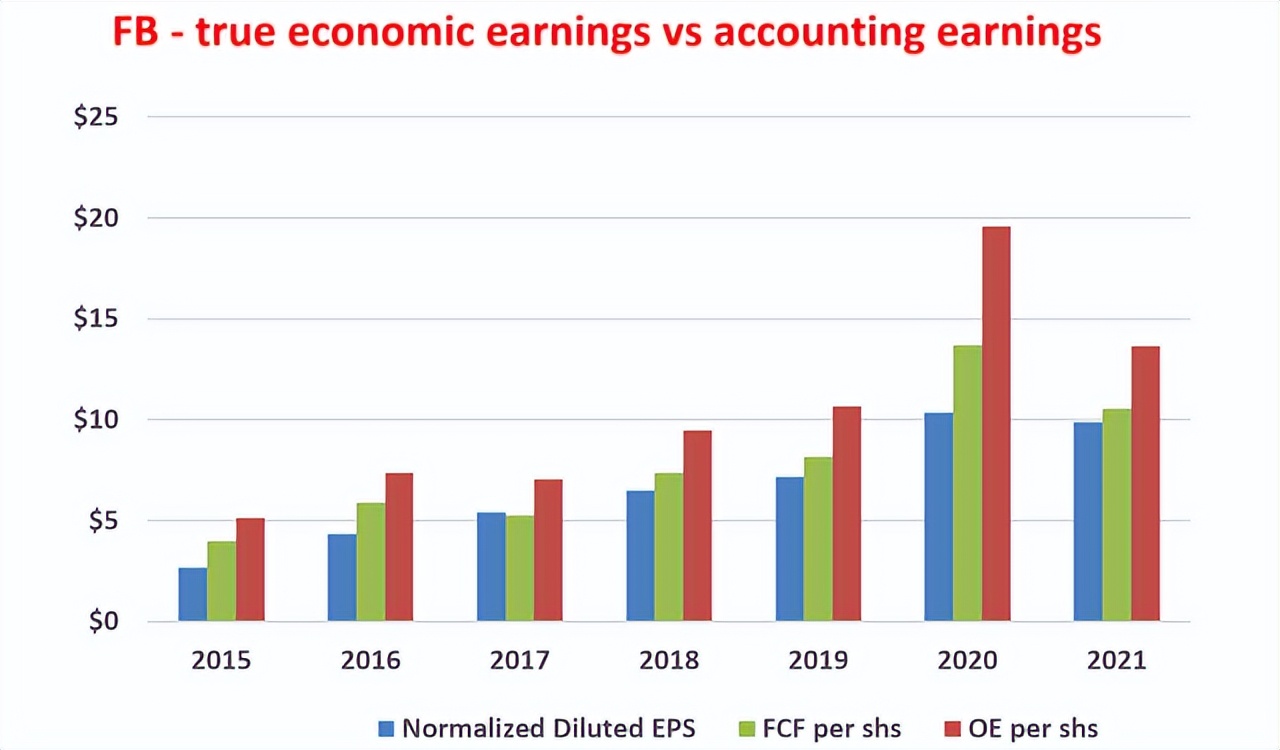 在此背景下,下图显示了FB近年来的真实经济收益与会计EPS和FCF的对比。这张图表的主要观察结果是: