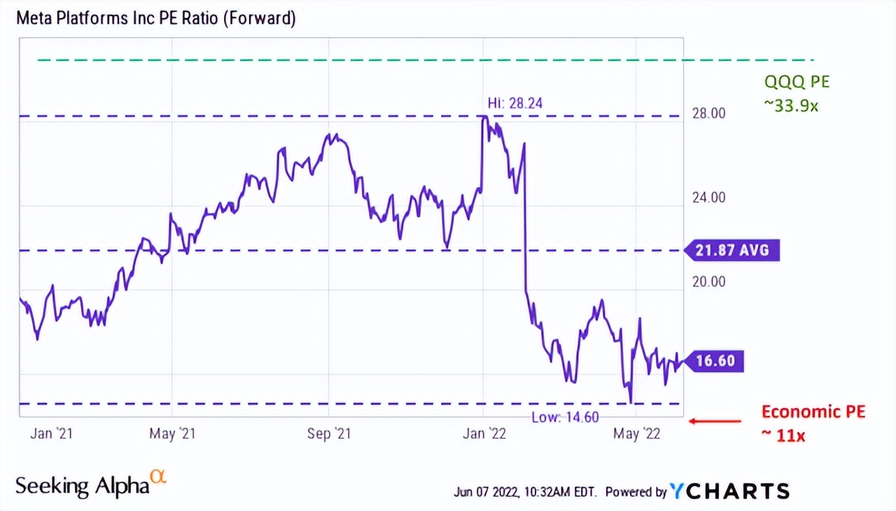 Meta目前是一只成长股,定价却是末期停滞股。其会计市盈率仅为16倍左右,所有者收益市盈率仅为11倍。