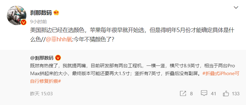 博主@刹那数码进一步爆料称,苹果研发部门目前有两台工程机,一台为横向折叠,一台为竖向折叠。前者展开后尺寸为8.9英寸,相当于两台iPhone 14 Pro Max拼在一起的大小,最终版可能还要比现在更大一圈。后者展开后为7英寸大小,且没有配备副屏,最终版不确定是否会加上。虽然我们不清楚折叠iPhone何时能上市,但可以大胆预测,苹果的加入必然使得市场发生一些变化,或许有望推动全球折叠屏设备的高速增长。
