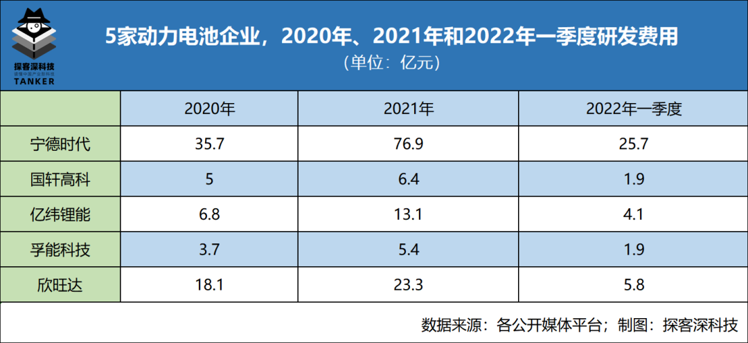 「探客深科技」梳理财报发现,宁德时代、国轩高科、亿纬锂能、孚能科技和欣旺达这5家动力电池企业,在2020年、2021年和2022年一季度的研发费用分别如下图所示。