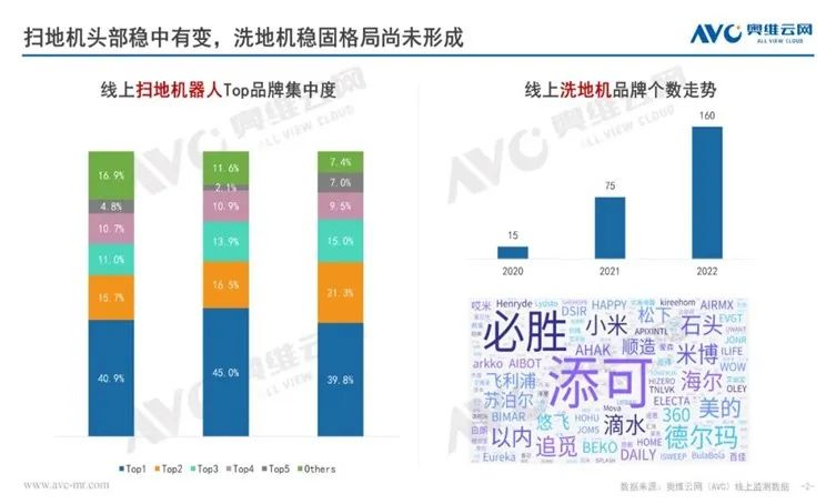 洗地机品类就不同了,因为该品类2020年刚起步,发展至今不过3年。2022年仅线上洗地机的品牌数量就有160个,竞争的激烈程度要胜于扫地机。