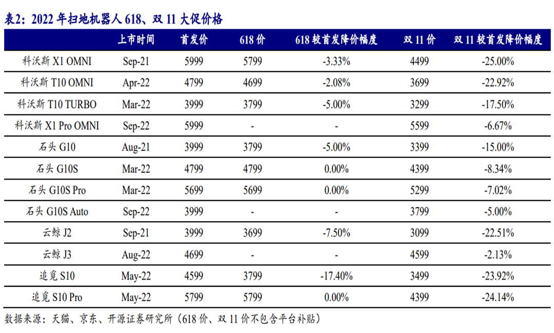 开源证券统计,去年双十一,科沃斯、追觅、云鲸等多款旗舰机较产品首发价降幅超过20%,石头科技旗舰产品的降幅最高也有15%。