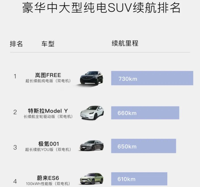 而以此和其他竞品车进行续航里程的比较,得出岚图FREE超长续航版是“豪华中大型纯电SUV续航第一”的结论。