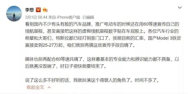 早在2019年,特斯拉发布了最便宜Model 3后,理想汽车创始人及CEO李想在微博中写道: