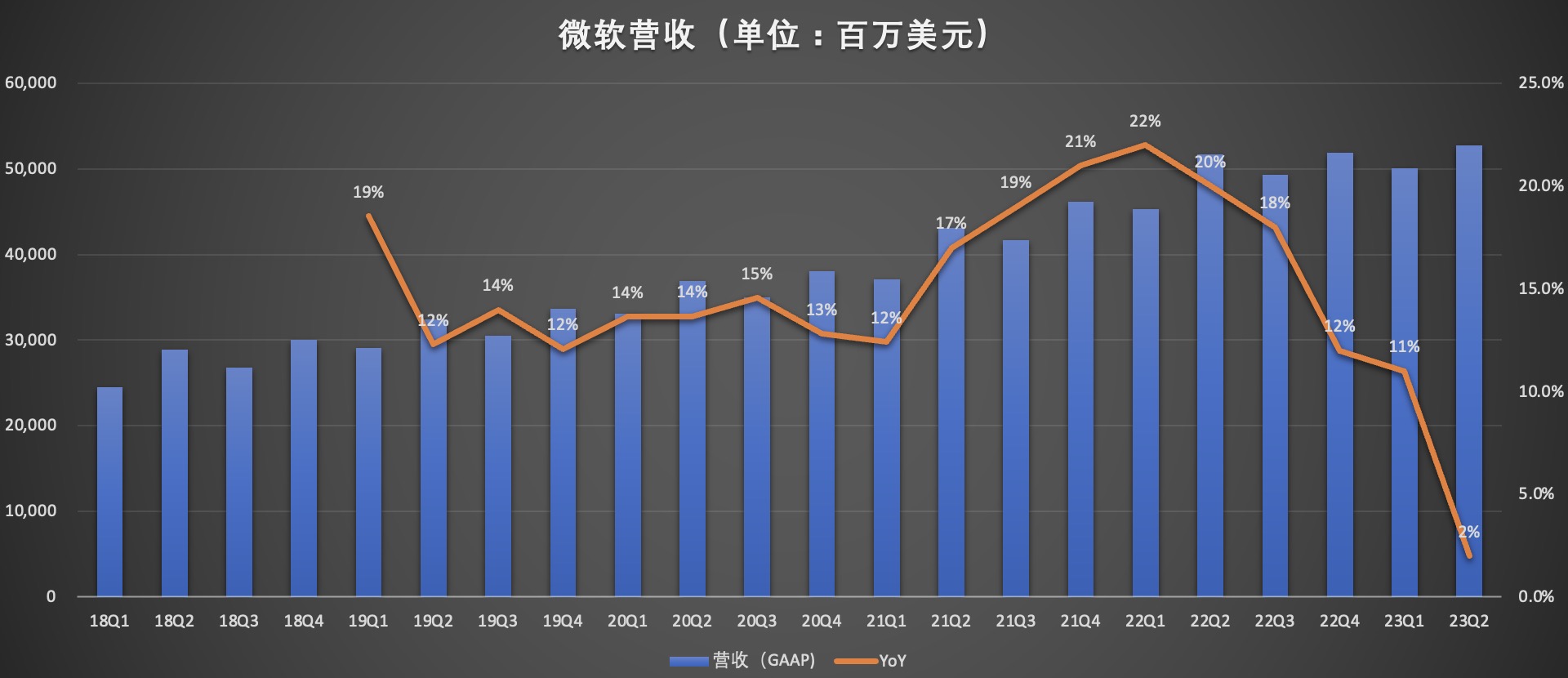 财报数据显示,微软2023年Q2实现527亿美元的总营收,同比仅增长2%,创近六个财年以来新低。