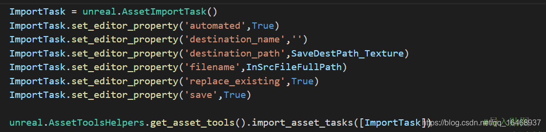 unreal.MaterialEditingLibrary.set_material_instance_texture_parameter_value(MIAsset,'AlbedoMap',TextureD) #材质实例设置属性值方法