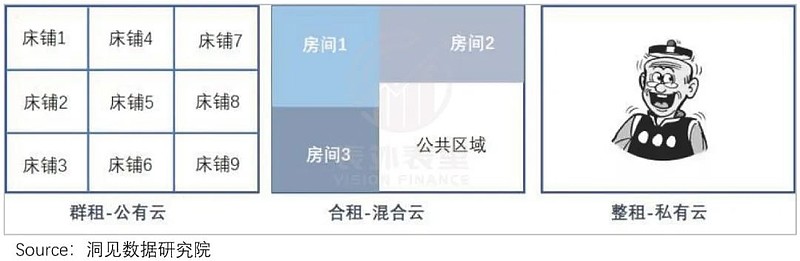 根据云资源的共享程度,云计算服务分公有云、混合云,私有云三大类。简单理解,就相当于群租、合租和整租: