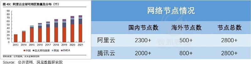 但就海外扩张而言,阿里云和腾讯云拥有的国内节点数都超过了2000+,但海外节点分支只有500+和800+,布局较为薄弱,需要很长的路要走。