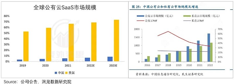 数据显示,2019年之前国内云市场由私有云主导,目前公有云业务有所提高,但私有云占比仍达43%;相比之下,美国以公有云为主,占比接近70%。
