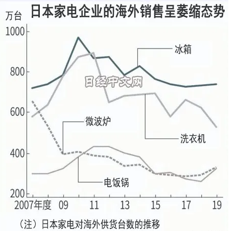 从2010年开始,日本家电品牌开始全线溃退。华尔街报道称,在2009年-2019年,十年间,日本电子行业产量锐减47%。而聚焦到海外销售,日本企业更为惨淡,以冰箱产业为例,2019年,其海外供货量较2010年的巅峰期,下降了四分之三。