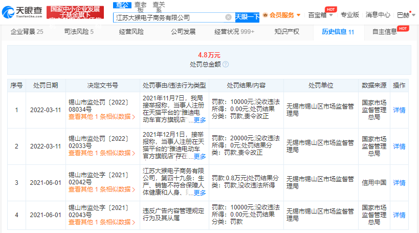 天眼查显示,2020年至2021年间,雅迪电动车在无锡、北京、广西和哈尔滨等多地的市场监管局的电动车质量抽检中,多次被检出多项质量安全不合规、不达标的问题。