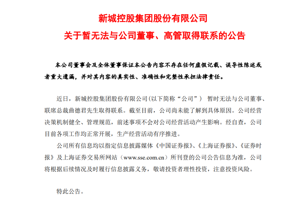 2月10日周五晚间,新城控股发布公告称,近日,公司暂时无法与公司董事、联席总裁曲德君取得联系。截至目前,公司尚未能了解到具体原因。