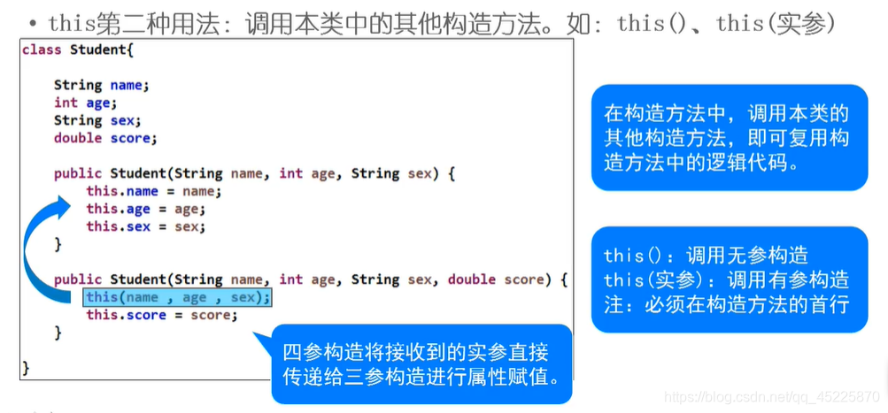 this(name,age,sex);//这里就是将接受到的实参直接传递给三参构造进行属性赋值,二免去了在写一边的麻烦。注意:必须要在第一行