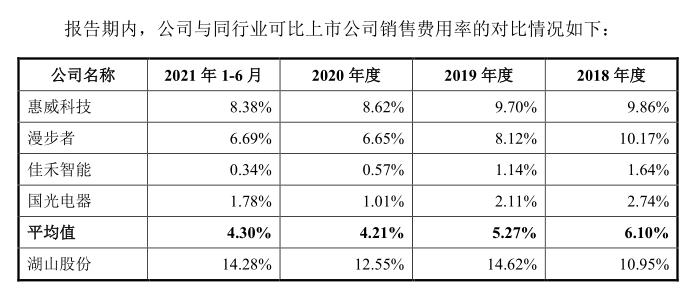 2018-2021年上半年,湖山股份的销售费用分别为4306.79 万元、6287.1万元、7158.48 万元、2689.39 万元,销售费用率分别为10.95%、14.62%、12.55%、14.28%,同行可比公司的销售费用率均值分别为6.1%、5.27%、4.21%、4.3%。