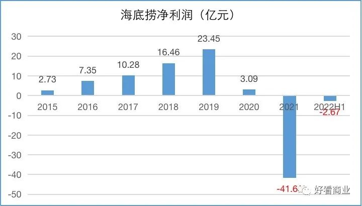 海底捞也在经历持续亏损。2021上半年,海底捞盈利9650多万元;2021全年,公司亏损41.6亿元。今年上半年,海底捞继续亏损2.67亿元,基本上把过去三年的净利润总额亏光了。