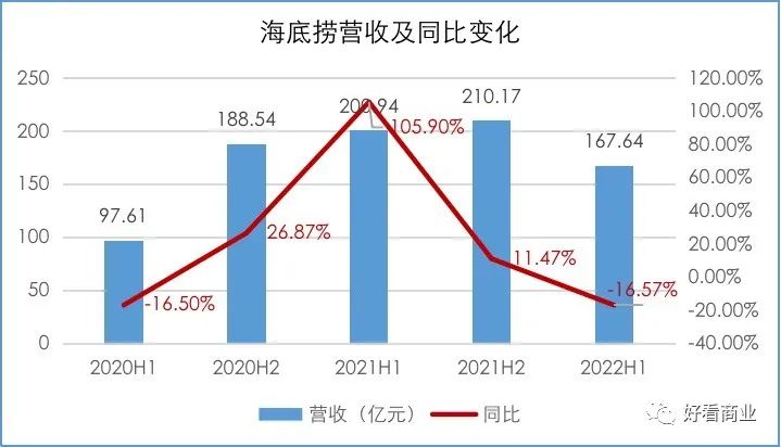 自2021年中期之后,海底捞营收增速出现明显下滑,2021下半年同比仅增长11.47%。到2022年上半年,海底捞实现营收167.64亿元,同比下降16.57%。