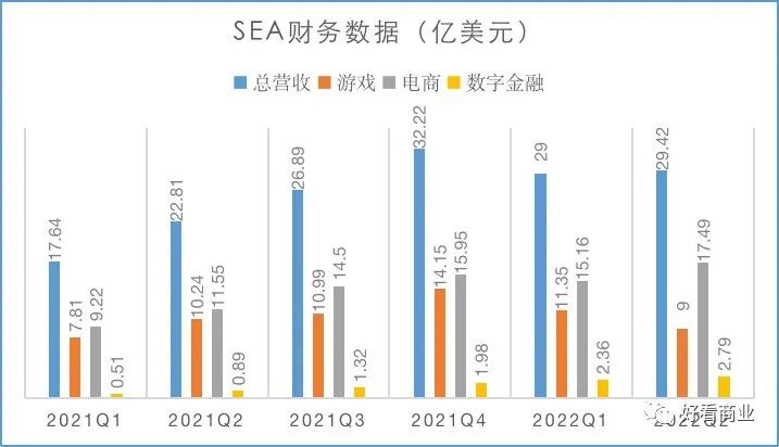 Sea今年Q1实现总营收29亿美元,同比增长64%,去年同期的增速为147%;Q2营收29.42亿美元,同比增速进一步下滑至29%,去年同期为159%。