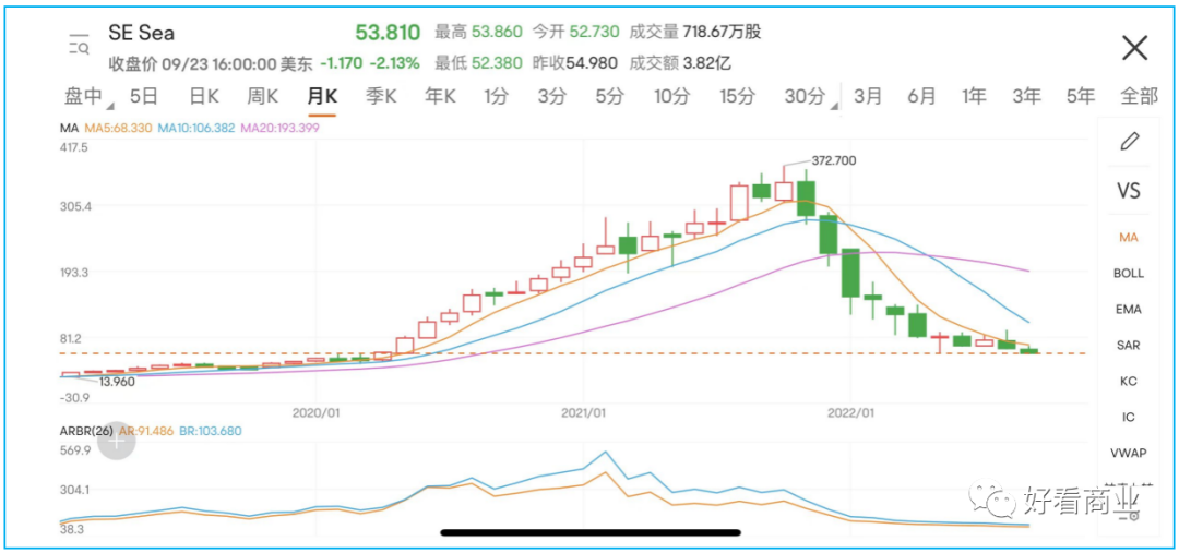 同时,2021年下半年,资本市场已经感受到寒意,还在疯狂烧钱、大幅亏损的公司不受欢迎了。Sea的股价在2021年10月触及372.7美元高点后,就一路向下了,二级市场融资变得困难。