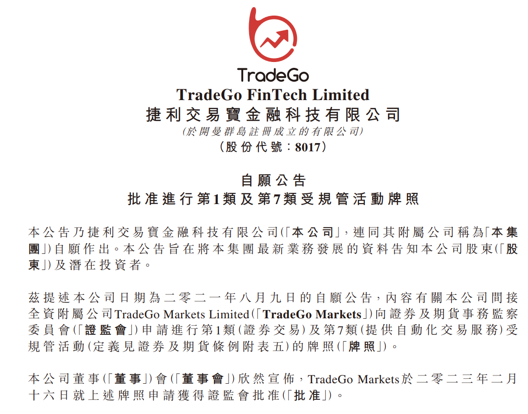 捷利交易宝是一体化证券交易平台服务供应商之一,主要服务于香港券商及其客户,至今已为150多家香港券商及200多万港股交易用户提供服务。此次获发牌照后,TradeGo Markets作为集团在中国香港的持牌业务平台,将可从事提供香港证券的场外交易服务、首次公开招股前的机构交易服务及专业机构投资者服务。