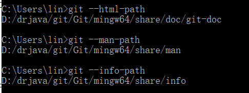 --html-path、--man-path、--info-path:分别显示 Git 的 HTML 文档、man 页面和 info 页面的路径。