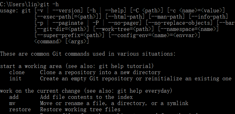 -h 或 --help:显示帮助信息,解释如何使用 git 命令和它的各个子命令。