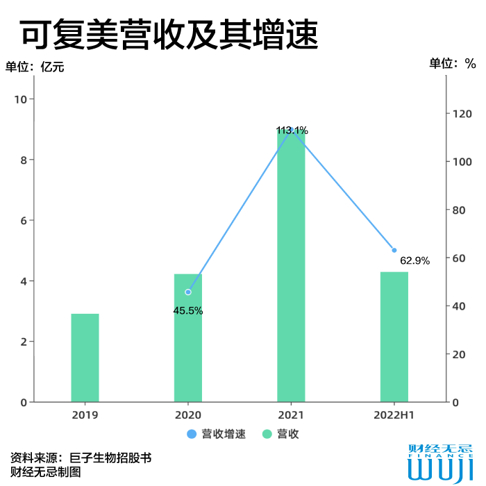 作为营收占比接近六成的大单品,巨子生物对可复美的依赖度非常大,但从财报数据来看,可复美的收入增速正在下滑,从2021年的三位数的增速下降到今年上半年的62.9%。