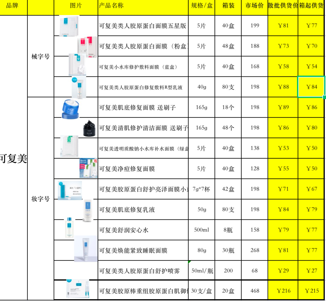 首先是,是价格体系的混乱。据一位可复美一级代理商向财经无忌发来可复美最新的代理价格,市场价、散批与箱起供货价格均不同,该代理商表示:“敷尔佳官方可以查看我们的授权书,可复美因为是跟公司合作签约的,因此没有公开。”