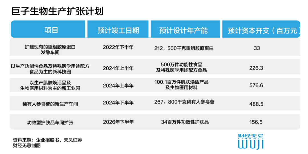 截至2021年,巨子生物重组胶原蛋白产能为每年10.88吨,IPO募资扩产后总设计产能将超过200吨,但这一产能水平只是华熙生物等玻尿酸龙头的四成左右。