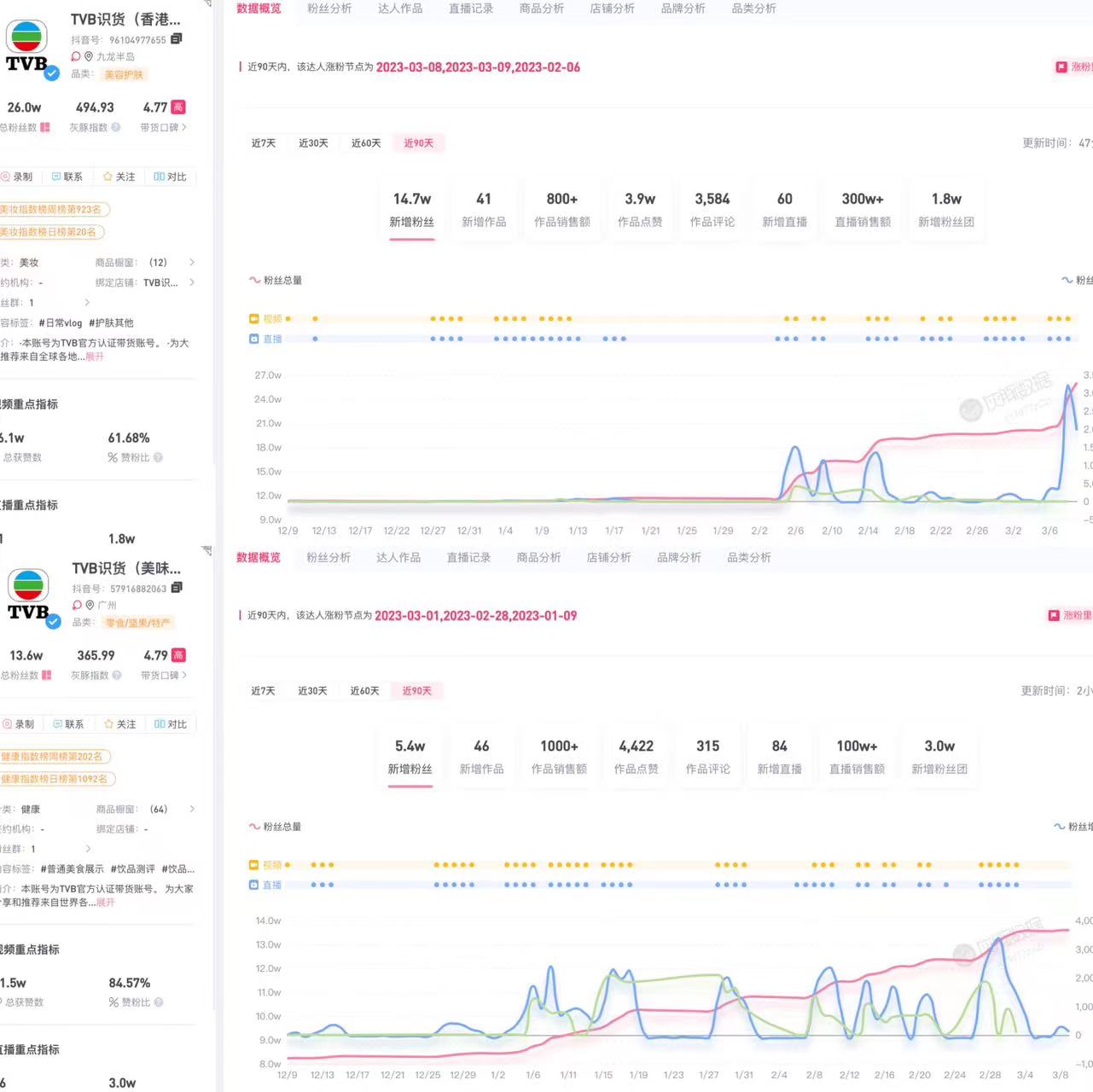 去年6月东方甄选爆火之际,TVB在抖音开设的账号“港式甄选”就一度被外界认为是在模仿东方甄选。不过,近一年以来,TVB的抖音矩阵发展并不稳定。灰豚数据显示,TVB识货(港式甄选)近三个月直播销售额1000万+。TVB识货的另外两个账号“TVB识货(香港严选)”和“TVB识货(美味甄选)”分别拥有23万粉丝和14万粉丝,近三个月分别直播带货300万+和100万+。
