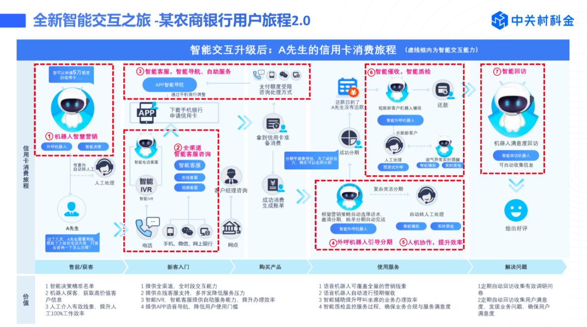 具体实施如下:智能服务方面,借助全新智能交互技术,为A银行重构信用卡客户服务旅程,通过智能外呼机器人在售前对客户进行触达,并筛选有意向客户进行人工客服转化;对于新客可通过全渠道智能客服咨询,实现电话、微信、手机银行等多渠道覆盖服务;在客户办理使用信用卡环节,为客户提供智能对话,智能导航、自助服务等,提升用户体验;在账单分期与查询服务上,客服机器人还可用于贷后催收环节,同时结合人工服务可灵活处理账单分期并可实现售后满意度调查及回访,提升回访效率。