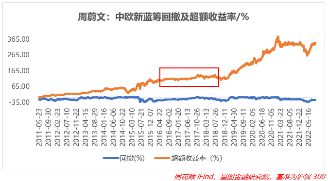 同期周蔚文于2011年5月下旬上任的中欧新蓝筹由于是混基,股票持仓比例不能高于80%,所以在业绩上相较偏股或普通股票型基金有所吃亏,但是在回撤上优势巨大。在2016年中之前,小盘股尤其是成长股暴露度最大,而同期创业板涨幅超过150%,收益也是大幅跑赢沪深300,而在这之后到2019年初,持仓风格频繁变动,也没有较好的踩准市场风格,所以同样出现了横盘(不知是不是和朱少醒商量好的)。好在2019年之后,对大盘的重视度有所上升,聚焦大盘成长和价值,在求稳的目标下打破了横盘的尴尬,超额收益进一步累积。在2022年风格演绎迅速、黑天鹅频发、杀估值严重的情况下回撤达到24.64%,不算大,突出老将的一个稳字。