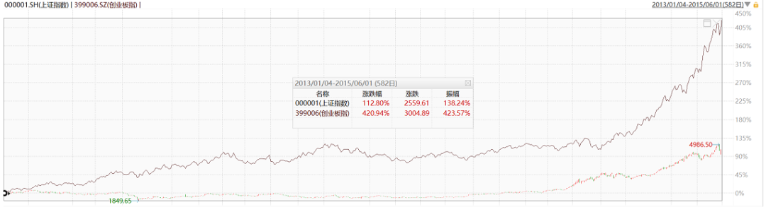 彼时为了扭转国内经济下滑的趋势,国家重点在中小企业身上发力,尤其是在融资问题上,宽松政策频吹,而股市大小盘的走势也因此分化严重。2013年到2015年中,上证指数涨了1倍,看起来已经不少了,但是创业板同期超过了4倍。