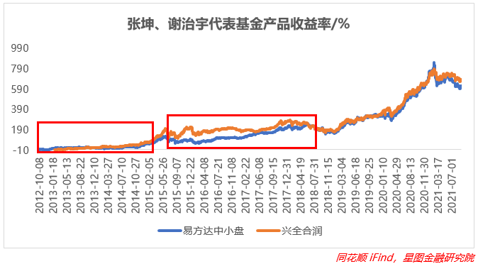 但在2015年到2019年这个阶段,谢治宇却又开启了长达3年的横盘,中小盘的甜头在2016年末终于走到了尽头,但是谢治宇并没有做出改变,直到2017年年末,他才把持仓重心转移到大盘成长上,紧接着又遭遇了2018年的普跌,业绩被进一步耽误,表现也没有张坤亮眼,而在2019年到2021年春节,抱团股高涨,张坤的超额收益曲线斜率更高并超过谢治宇,要知道同期张坤的基金规模是谢治宇的2-3倍!管理难度更高,可想而知张坤的能力有多强。