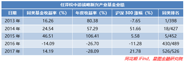 在这种风格分化明显的情况下,重点挖掘创业板中符合“战略新兴产业”股票的任泽松一战成名——2013年,在管的基金中邮战略新兴产业全年净值增长80.38%,而在当年同类基金仅有16.33%的平均涨幅。次年,创业板起起落落终于在年末重回2013年的起点,但是任泽松凭借着东方网力(已退市)、尔康制药、博腾股份、旋极信息等重仓股的暴涨,打破了冠军魔咒,虽然由于没有坚守成长,错过了2014年蓝筹股的上涨行情,但是全年市场排名依旧处在前4.5%,打破了“冠军魔咒”,又一次惊艳了众人。