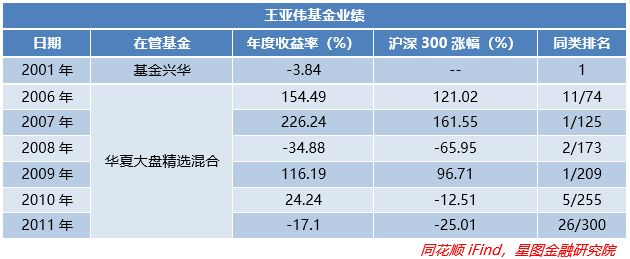 作为21世纪中国公募基金界的第一位超级明星,从2001年的基金兴华开始,到2011年的华夏大盘精选,王亚伟生涯共拿过三次冠军、一次亚军,即便业绩最差的2011年也是全市场第26名。这是一个什么概念,据统计自1998年第一只基金问世以来,能够蝉联或者两次以上夺冠的基金仅有三只,而王亚伟管理过的两只基金全都两次夺冠(虽然基金兴华中途更换了一次经理)!可以说是以一己之力创造了一个几乎无法超越的记录。