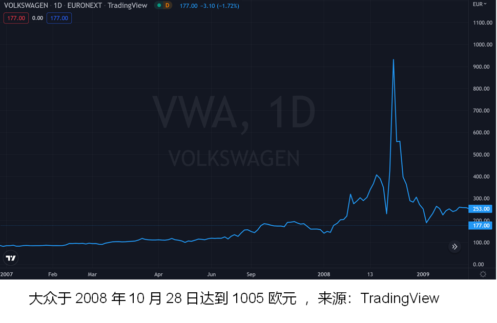2008年夏天,保时捷控股对大众持股比例达到42.6%之后便不再有新的增持公告,市场传言保时捷控股即将放弃收购大众,加之次贷危机全面爆发,“空头大军”甚至纷纷加大做空仓位,到了2008年10月23日,这些空头仓位已经占了总股份的10.4%。