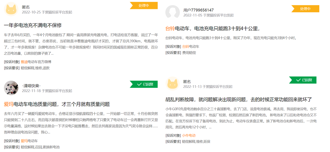 这几项投诉,可以说完美切中行业的命门:电动两轮车的高端化升级,主要就是围绕续航能力、锂电池和智能化这些环节进行的。而消费者的不满,又恰好集中在这些环节。** **