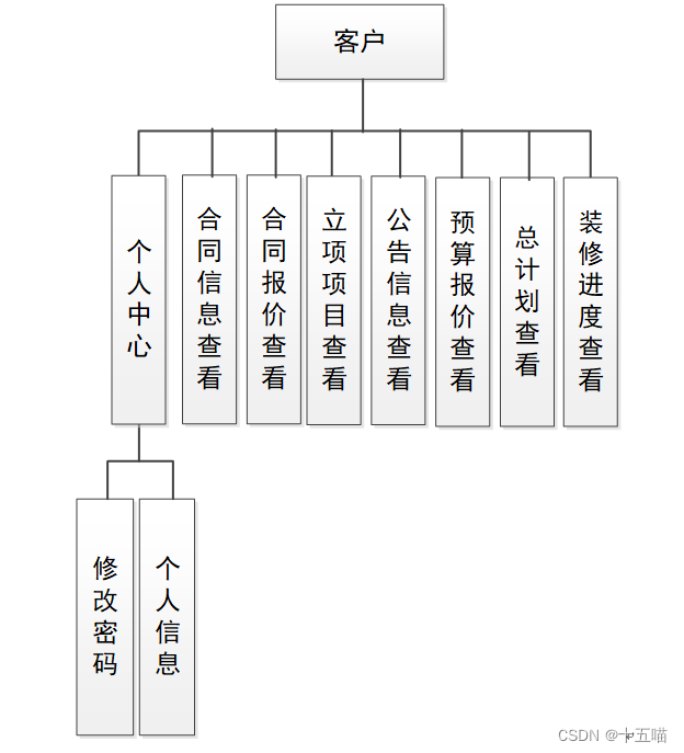图4.3即为设计的客户功能结构,客户权限操作的功能包括查看合同报价,查看合同信息,查看立项项目,查看预算报价,查看装修进度,查看公告信息等。