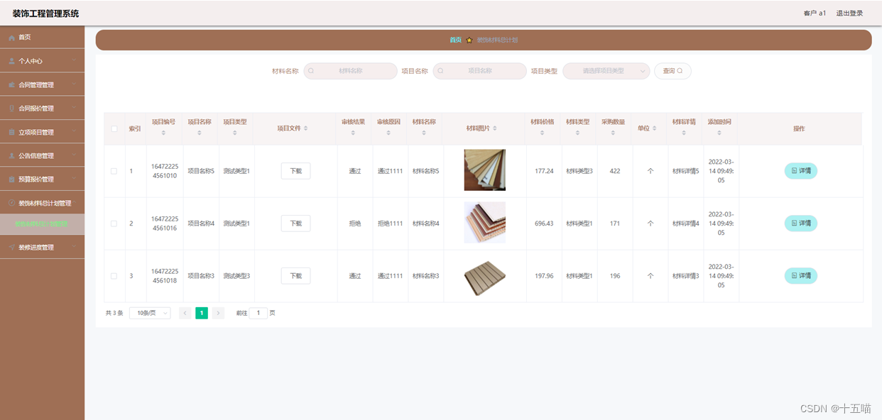 图5.10 即为编码实现的装饰材料总计划查看界面,客户查看材料价格,材料图片,采购数量,材料详情,材料名称等信息,可以查看装饰材料总计划详情信息,同时可以根据材料名称或项目名称来查询装饰材料总计划信息等。