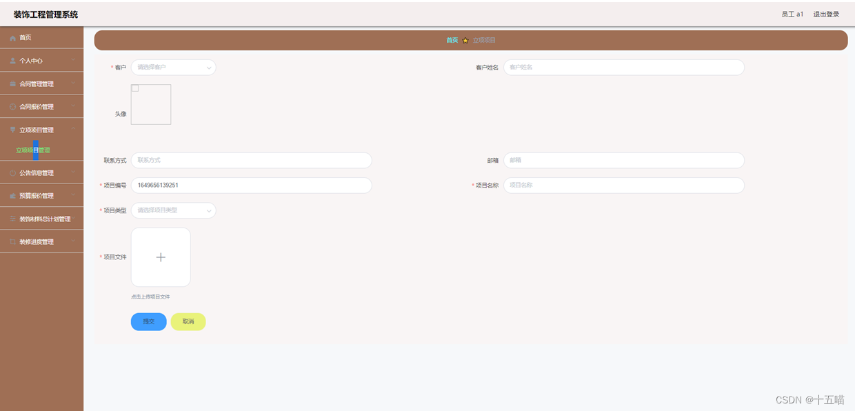 图5.5 即为编码实现的新增立项项目界面,员工在新增立项项目界面中登记立项项目信息,主要包括客户姓名,联系方式,项目类型,项目文件等信息,登记完成立项项目信息之后,直接提交。