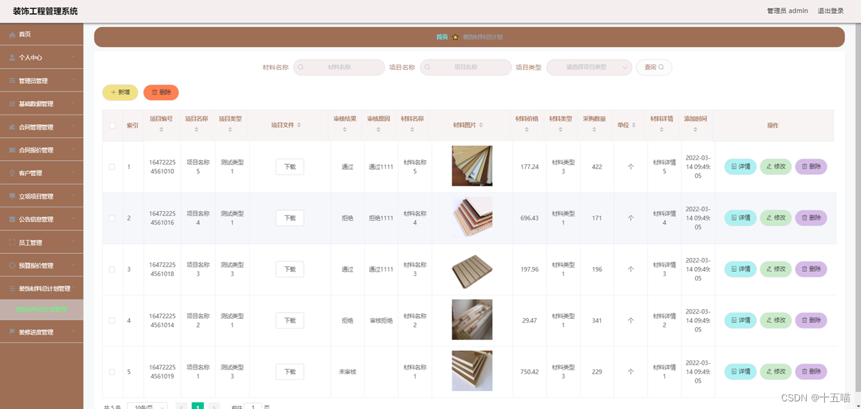 图5.3 即为编码实现的装饰材料总计划管理界面,装饰材料总计划信息包括材料名称,材料价格,材料采购数量,材料详情等信息,管理员可以修改装饰材料总计划信息,可以查询装饰材料总计划信息,可以删除装饰材料总计划信息等。