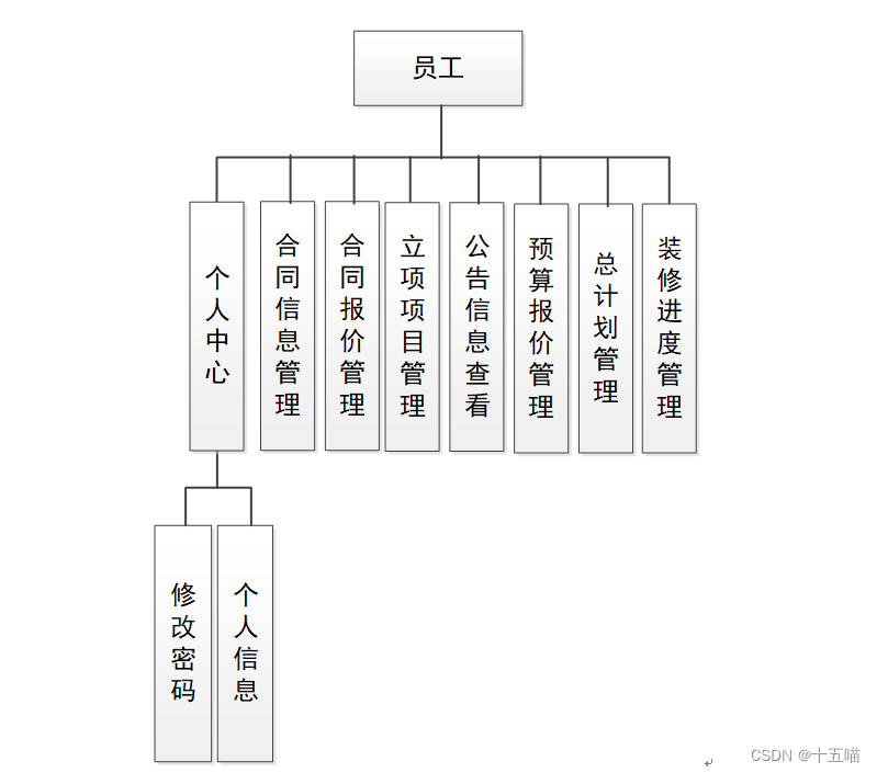 图4.2即为设计的员工功能结构,员工权限操作的功能包括对合同信息,合同报价信息,立项项目信息,预算报价信息,装饰材料总计划信息,装修进度信息等进行新增并管理。