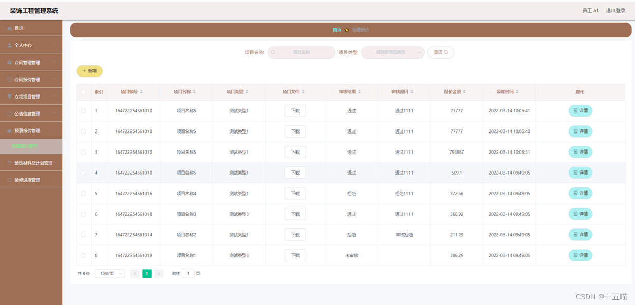 装饰工程管理系统——项目立项子系统可以实现合同信息管理,合同报价管理,客户管理,立项项目管理,公告信息管理,员工管理,预算报价管理,装饰材料总计划管理,装修进度管理等功能。该系统采用了Mysql数据库,Java语言,Spring Boot框架等技术进行编程实现。