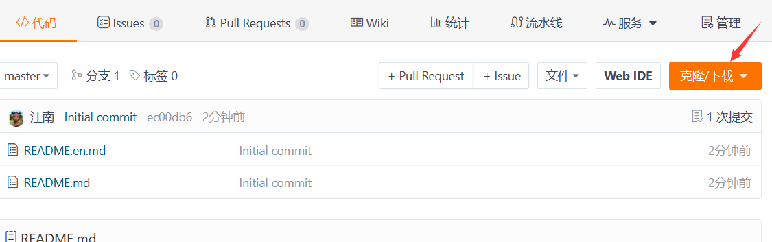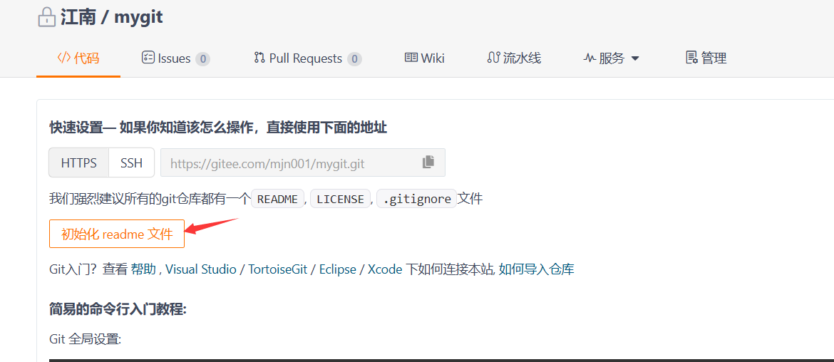 初始化readme文件,这样子你的git的仓库就创建完成啦!仓库会默认有一条master分支