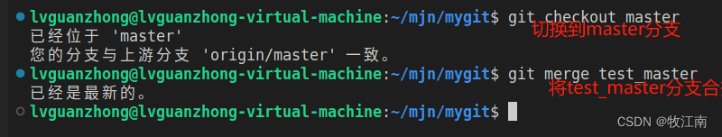 git merge 命令可以将任意分支合并到到当前分支中去,如我当前在master分支下,执行git merge test_master命令就可以将test_master分支的修改内容合并到master分支下了。
