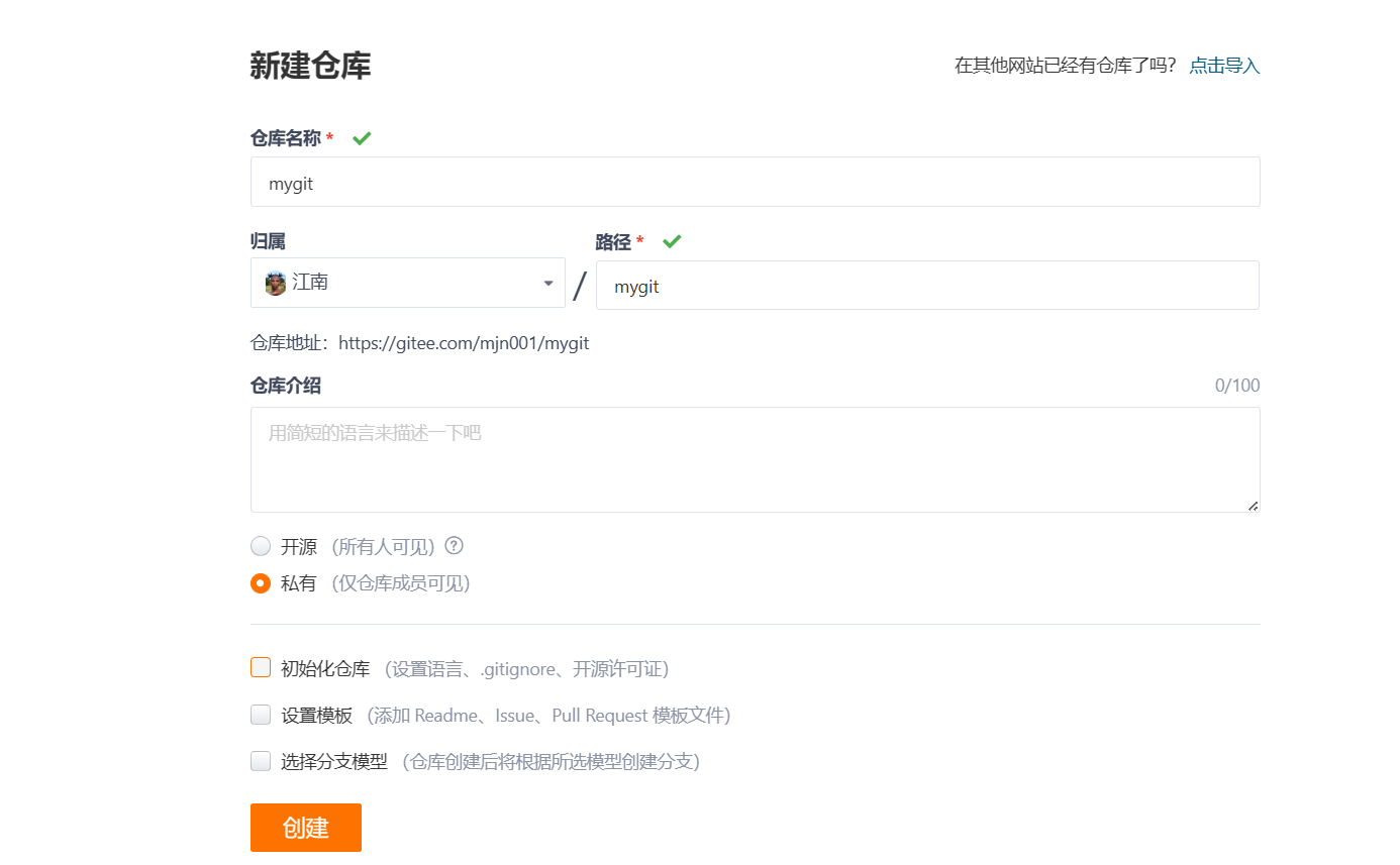 接下来就是设置git仓库名称(随意),和设置仓库权限:开源(所有人都可以看到仓库的东西),