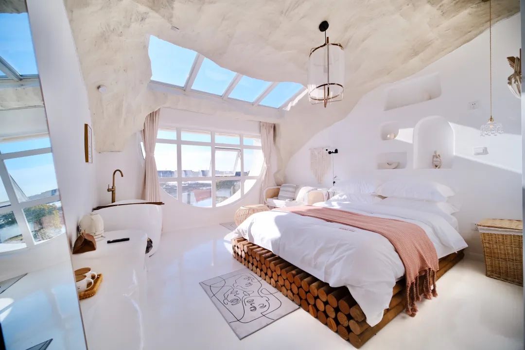 2022年,沈扬与合伙人加大投入开出了拥有17个房间的第三家民宿门店。这家新店融合了时下更受年轻用户喜爱的诧寂风和地中海风格,总投资600万,仅设计费用就高达50万。而目前新店的房价,平均每间也能够卖到700-800元。