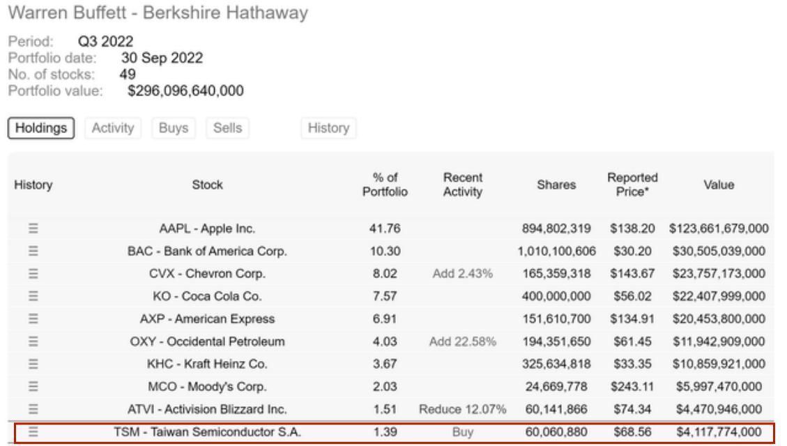 但有时,他的一些选择仍然让人感到惊讶,他最近在作为全球半导体公司龙头——台湾积体电路制造股份有限公司(即Taiwan Semiconductor, 股票代码:TSM)(以下简称“台积电”)的增持就是一个显著的例子。